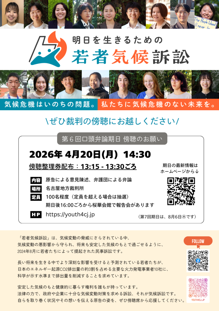 若者気候訴訟の第6回口頭弁論期日が、2026年4月20日(月)14時30分から名古屋地方裁判所において開かれます。期日では、原告と弁護団が法廷で意見陳述を行います。
